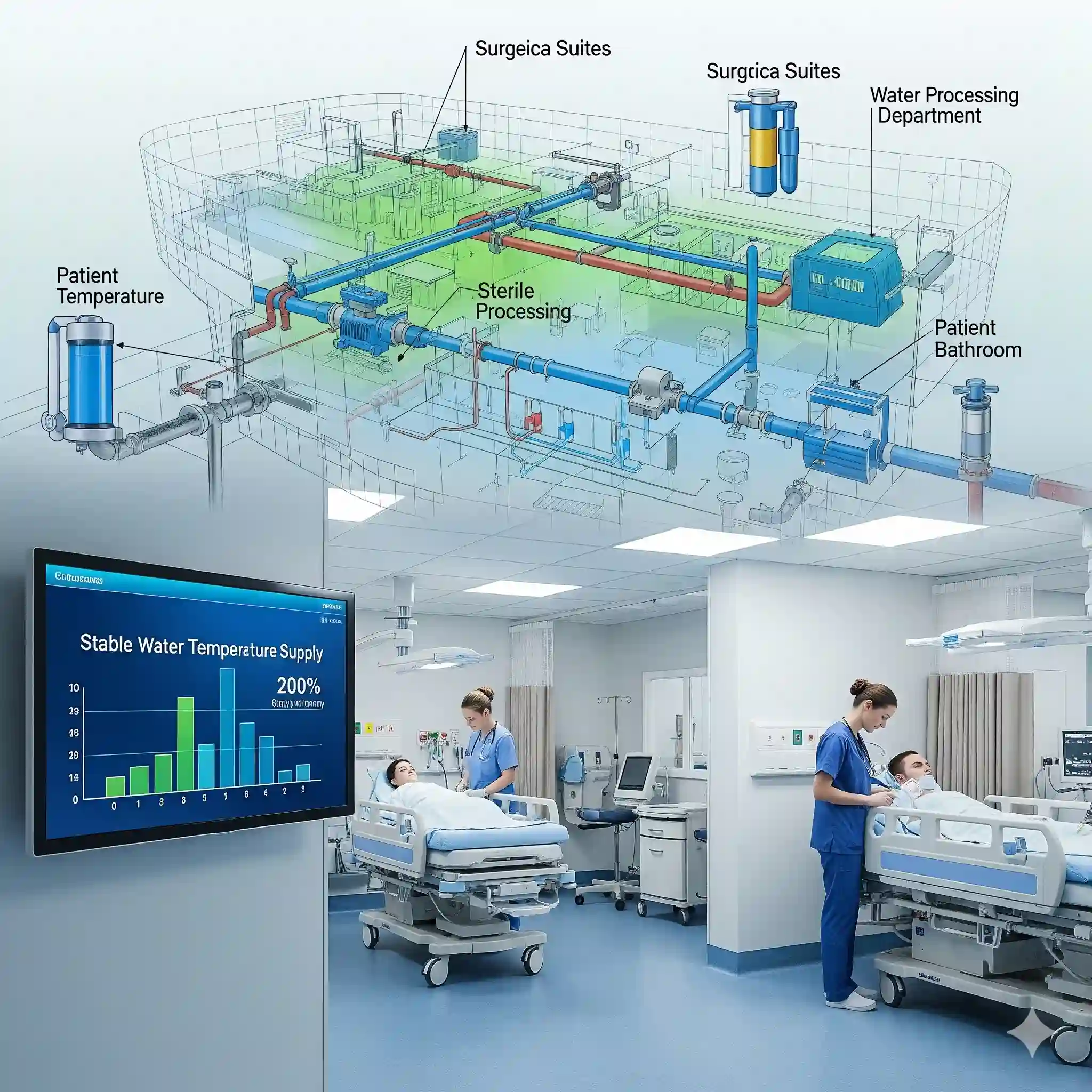 Our water solutions help healthcare facilities maintain optimal water supply and temperature control, supporting patient care and operational efficiency.