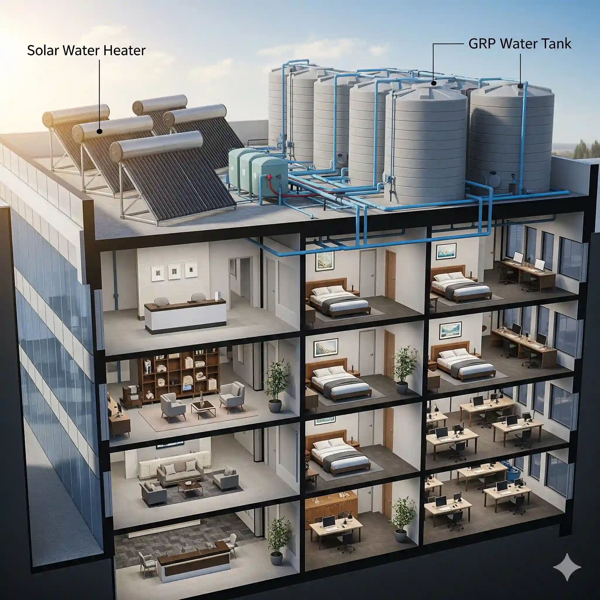 From hotels to office buildings, our Solar Water Heaters and GRP Water Tanks provide consistent and cost-effective water solutions for large-scale commercial establishments.
